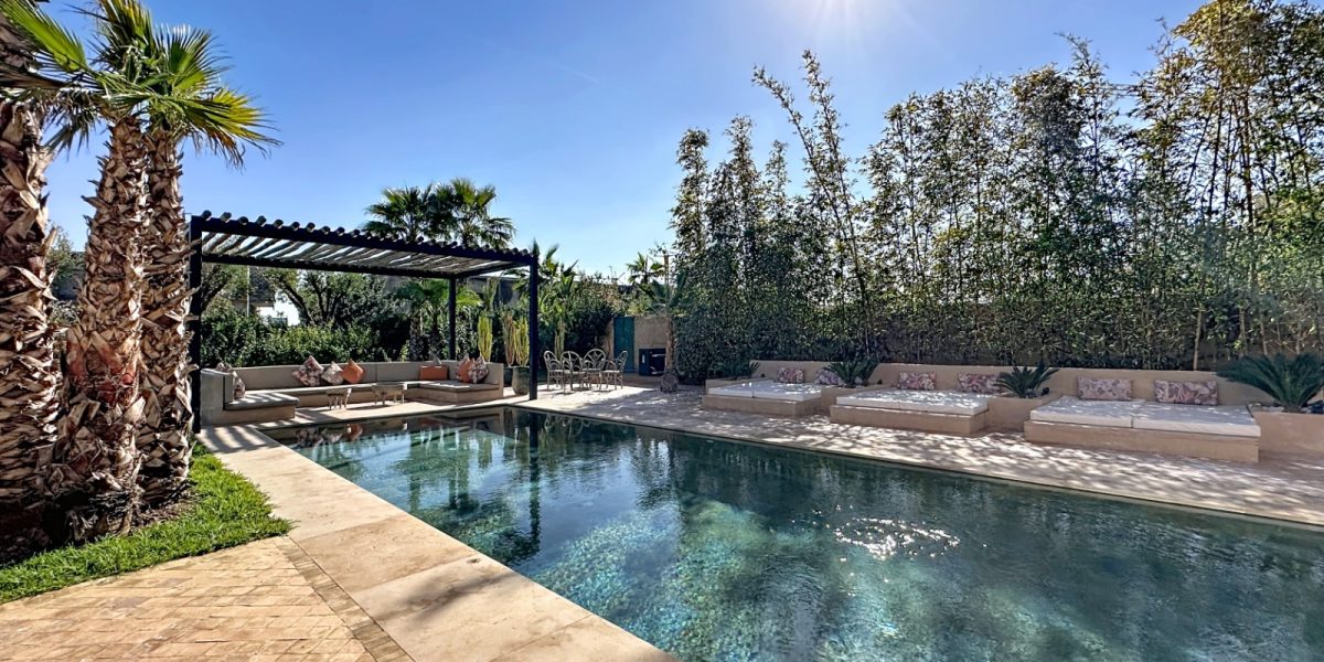 Située au cœur du très prisé domaine d’Amelkis à Marrakech, cette magnifique villa contemporaine séduit par son architecture moderne, ses volumes généreux et son atmosphère raffinée. Édifiée sur un terrain de 1 200 m², elle développe une surface habitable de 550 m², offrant un cadre de vie aussi luxueux que confortable. La villa se compose de cinq superbes suites, chacune pensée comme un espace privé alliant élégance, confort et intimité. Les espaces de réception, baignés de lumière grâce aux larges baies vitrées, s’ouvrent harmonieusement sur le jardin, créant une continuité parfaite entre intérieur et extérieur. Le salon, aux lignes épurées et aux volumes impressionnants, invite à la convivialité, tandis que la décoration contemporaine, soignée dans les moindres détails, confère à l’ensemble une ambiance chaleureuse et sophistiquée. La villa est vendue entièrement meublée, avec un mobilier de qualité sélectionné avec goût. À l’extérieur, un jardin paysager entoure une magnifique piscine, véritable cœur de la propriété, idéale pour profiter pleinement du climat de Marrakech en toute tranquillité. L’ensemble offre un cadre paisible, sécurisé et recherché, à quelques minutes seulement du centre-ville et des golfs renommés. Un bien rare sur le marché, parfait pour une résidence principale, secondaire ou un investissement de prestige, au sein de l’un des domaines les plus exclusifs de Marrakech